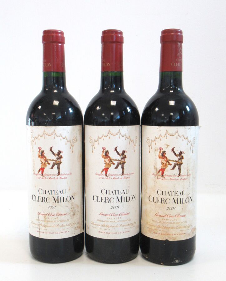 3 Blles CH. CLERC MILON Pauillac GCC 2001 Et.: 1 un peu tachée, 2 plus tachées. N : mi goulot.