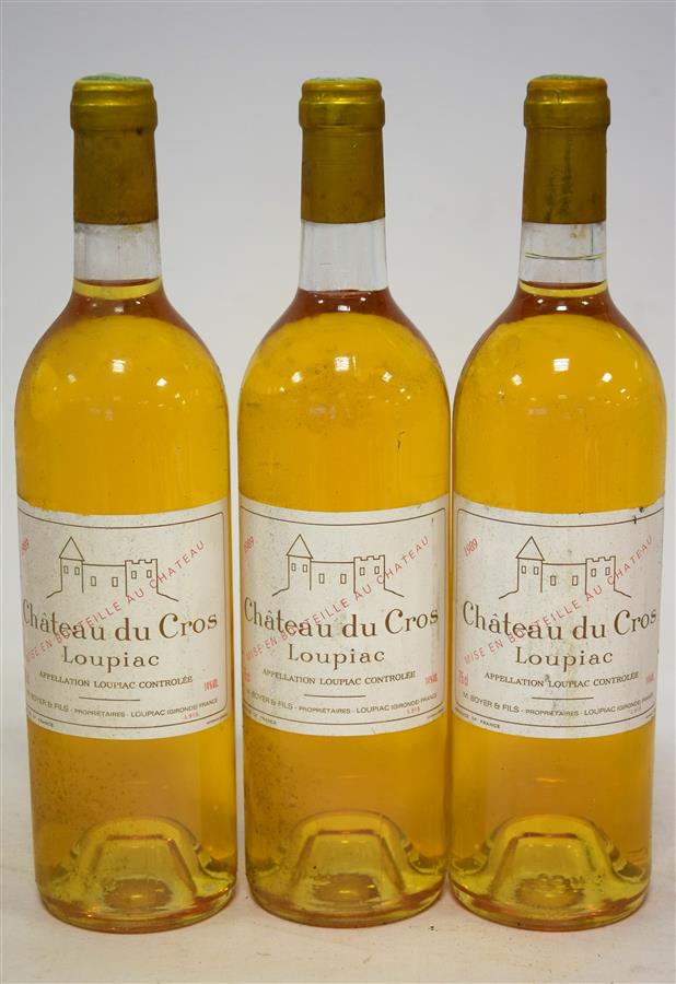 3 Blles CH. DU CROS Loupiac 1989 Et. un peu tachées. N : bas goulot.