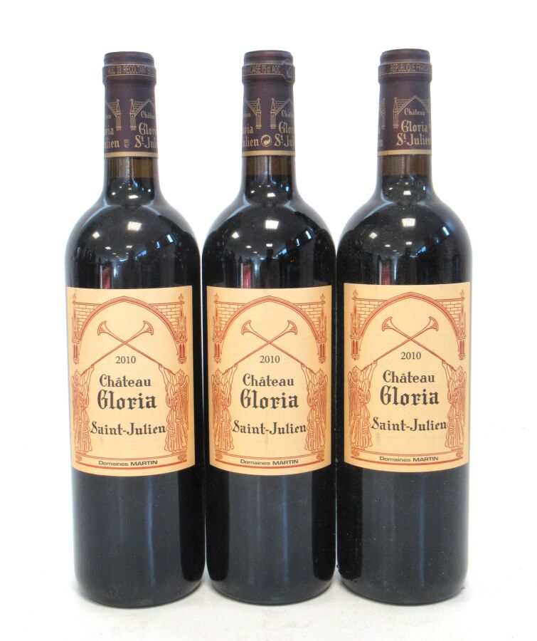 3 Blles CH. GLORIA St Julien 2010 Et. à peine tachées. N : mi goulot.