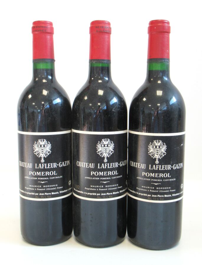 3 Blles CH. LAFLEUR GAZIN Pomerol 1992 Et. excellentes. N : 1 haut goulot, 2 mi goulot.