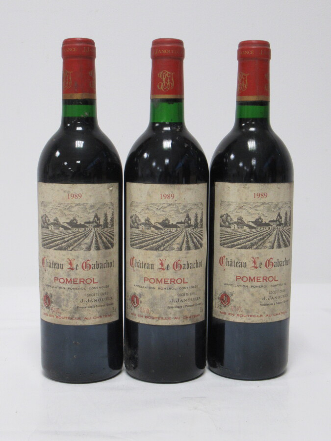3 Blles CH. LE CABACHOT Pomerol 1989 Et. fanées et tachées. N : 2 mi/bas goulot, 1 bas goulot.