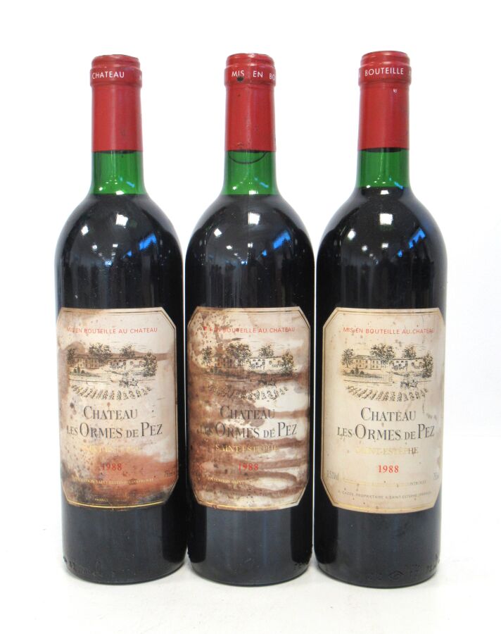 3 Blles CH. LES ORMES DE PEZ St Estèphe 1988 Et.: 1 un peu tachée, 1 tachée, 1 plus tachée. N : 1 bas goulot/limite haut épaule, 2 limite haut épaule.