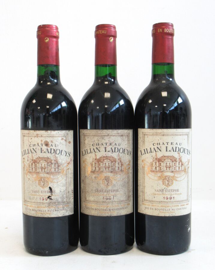 3 Blles CH. LILIAN LADOUYS St Estèphe 1991 Et. tachées. N : mi/bas goulot.