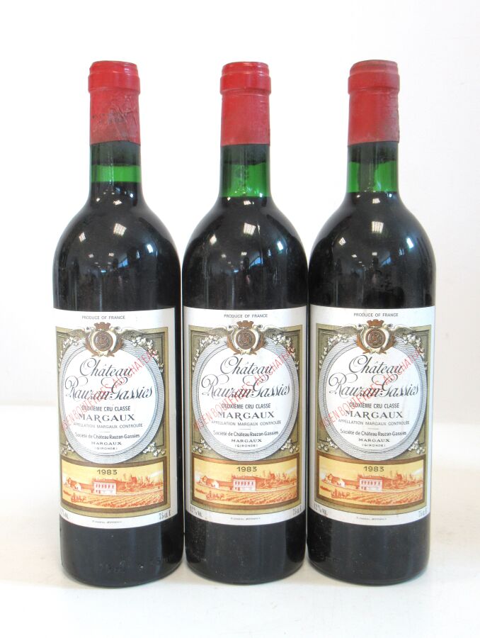 3 Blles CH. RAUZAN GASSIES Margaux GCC 1983 Et. à peine tachées. N : 1 mi/bas goulot, 1 bas goulot, 1 bas goulot/limite haut épaule.