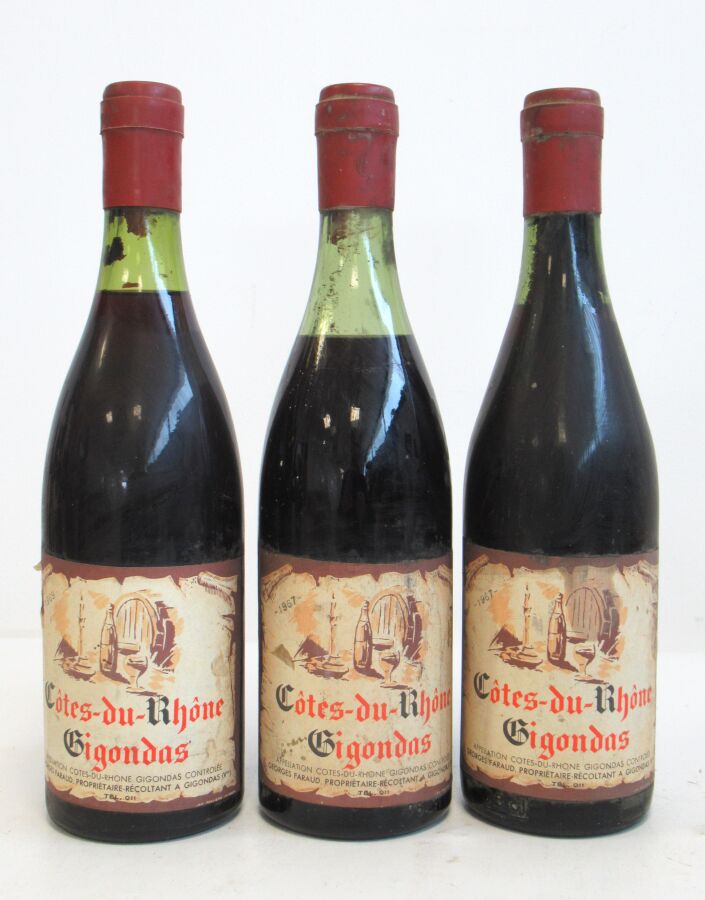 3 Blles GIGONDAS mise Georges Faraud Prop. : 1 blle de 1969, 2 blles de 1967. Et. fanées et tachées. N : 3 à 5 cm.
