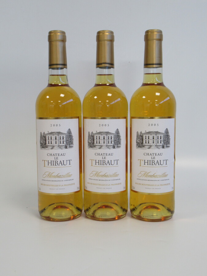 3 Blles MONBAZILLAC mise Château Thibaut 2005 Et. un peu tachées. N : mi goulot.