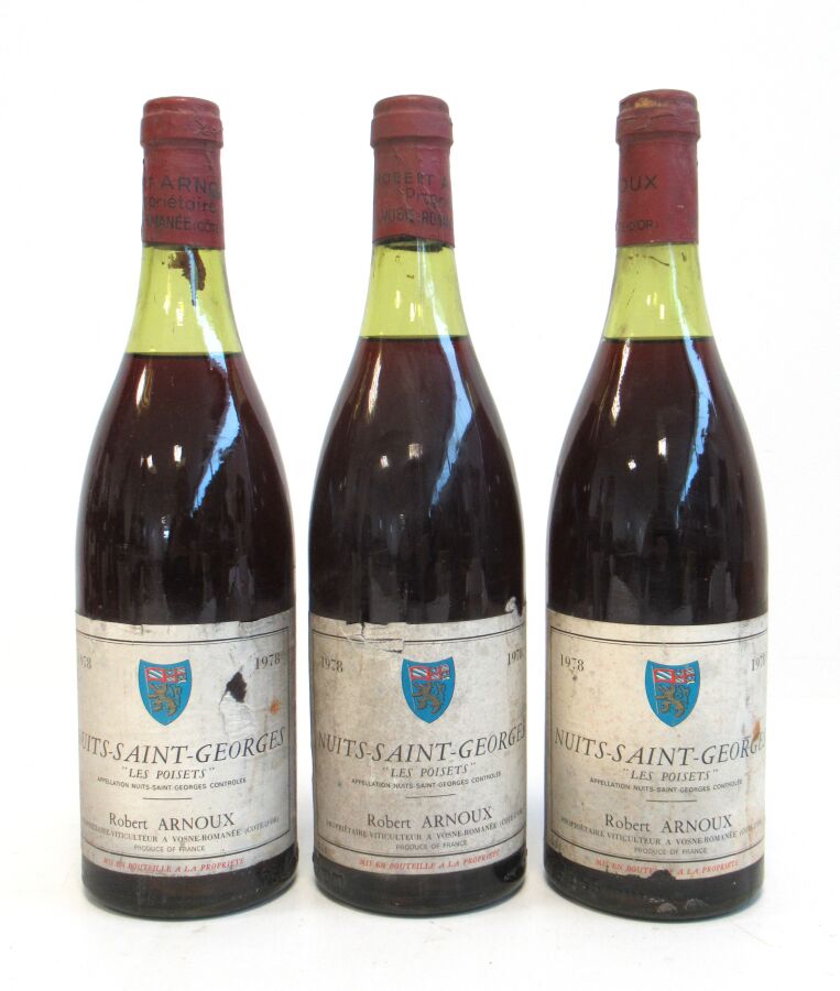 3 Blles NUITS SAINT GEORGES Les Poisets mise Robert Arnoux Prop. 1978 Et. tachées et un peu déchirées. N : 3,5 à 4 cm.