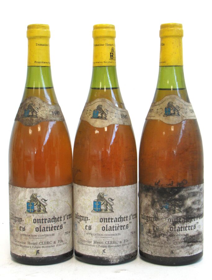3 Blles PULIGNY MONTRACHET 1er Cru Les Folatières mise Dom. H. Clerc & Fils. 1987 Et. tachée. N : 3 cm.