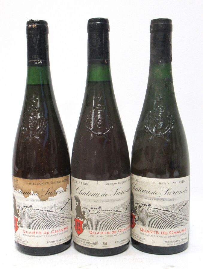 3 Blles QUARTS DE CHAUME Château de Suronde 1 blle de 1991, 2 blles de 1985. Et. tachées. N : 2 à 3 cm.