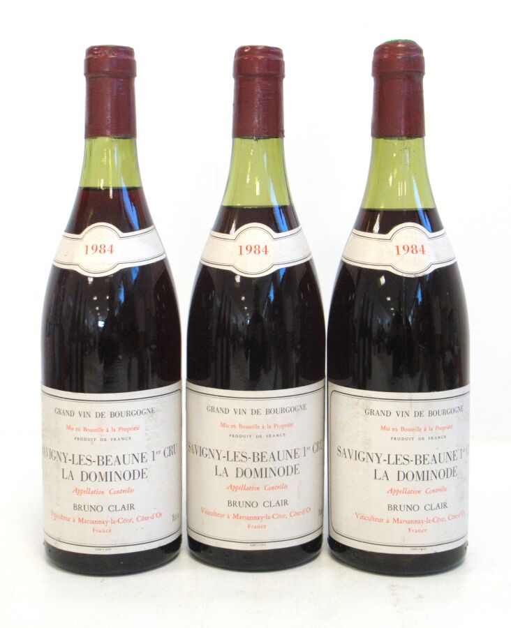 3 Blles SAVIGNY LES BEAUNE 1er Cru La Dominode mise Bruno Clair Vit. 1984 Et. un peu tachées. N : 1 x 3 cm, 2 x 4 cm.