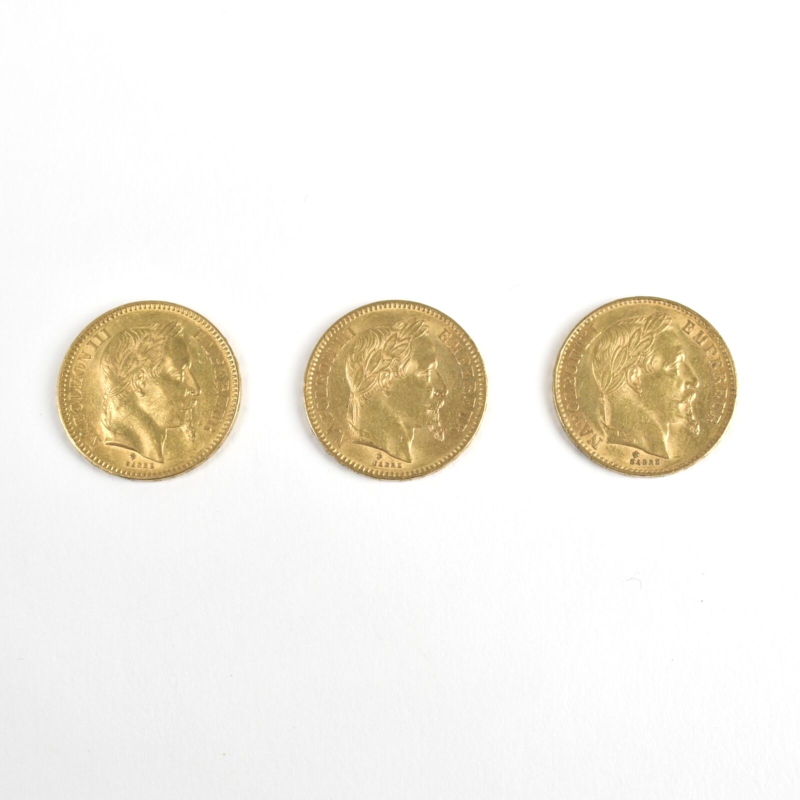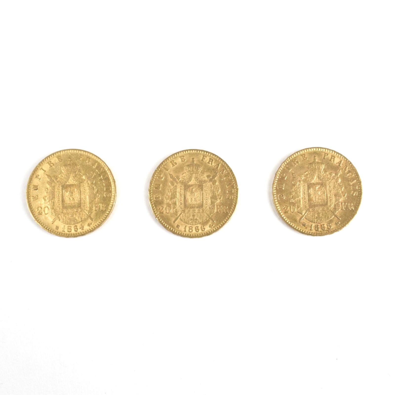3 x 20 Francs or, Napoléon III "Tête nue" : 1 x 1868 ; 1 x 1866 ; 1 x 1864, Poids brut : 20 g environ.