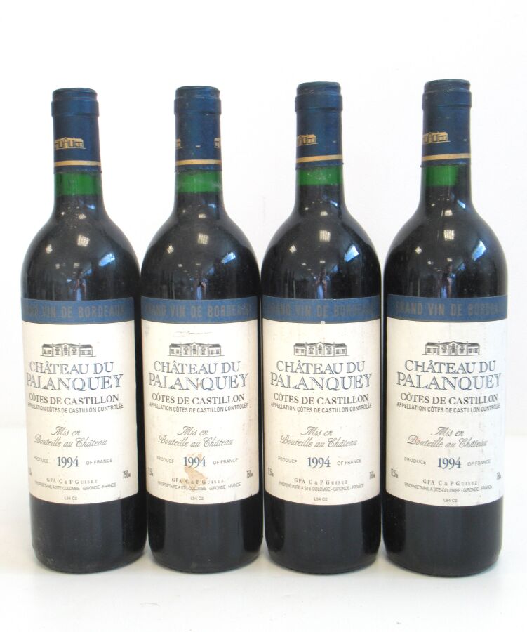 4 Blles CH. DU PALANQUEY Côtes de Castillon 1994 Et. un peu tachées. N : mi goulot.