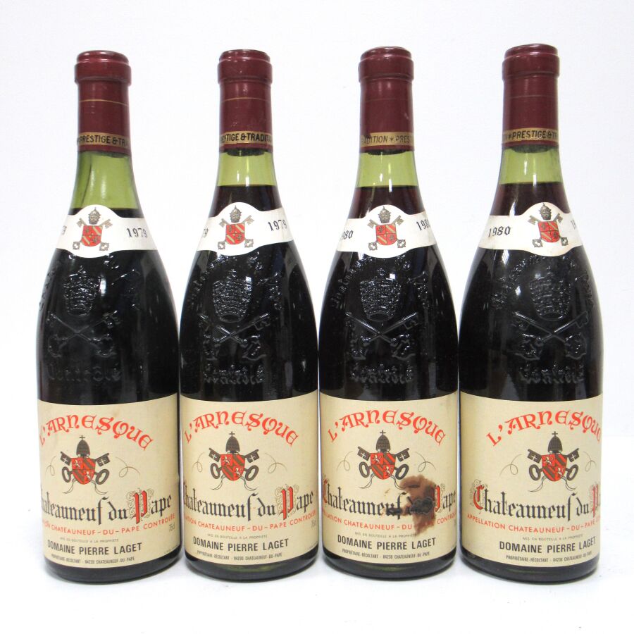 4 Blles CHATEAUNEUF DU PAPE L'Arnesque mise Dom. P. Laget : 2 blles de 1980, 2 blles de 1979. Et.: 3 à peine tachées, 1 tachée. N : 2 à 3 cm.