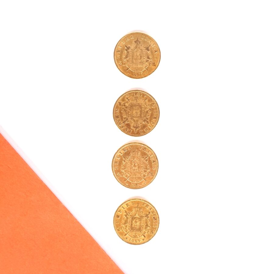 4 x 20 Francs or, Napoléon tête laurée, 1 x 1862 A, 1 x 1863 A, 1 x 1864 A et 1 x 1866 B, Poids brut : 25.7 g environ.