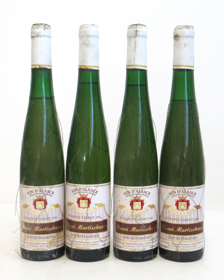 4 x 50 cl GEWURZTRAMINER Vendange Tardive mise H. Martischang Vit. 1995 Et. un peu tachées. N : 2 à 4 cm.