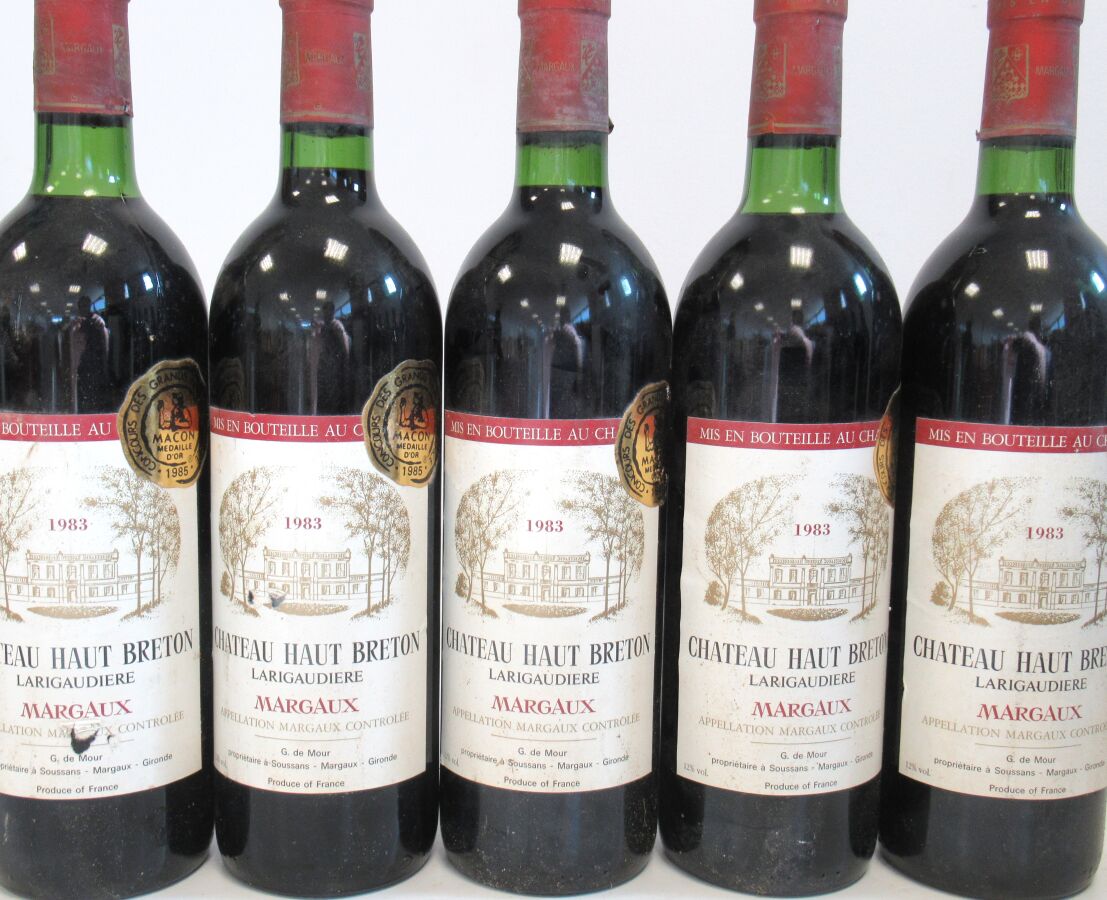 5 Blles CH. HAUT BRETON LARIGAUDIÈRE Margaux 1983 Et. un peu tachées (1 déchirure). N : 1 mi/bas goulot, 2 bas goulot, 2 limite haut épaule.
