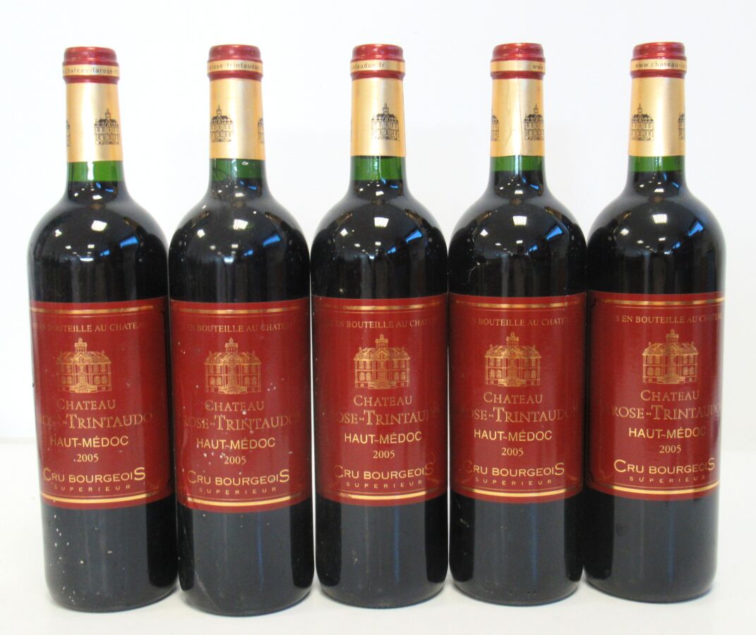 5 Blles CH. LAROSE TRINTAUDON Haut Médoc CBS 2005 Et.: 3 impeccables, 2 à peine tachées. N : mi/bas goulot.