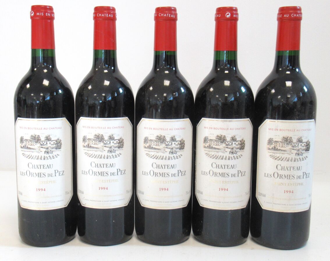 5 Blles CH. LES ORMES DE PEZ St Estèphe 1994 Et. à peine tachées. N : mi goulot.