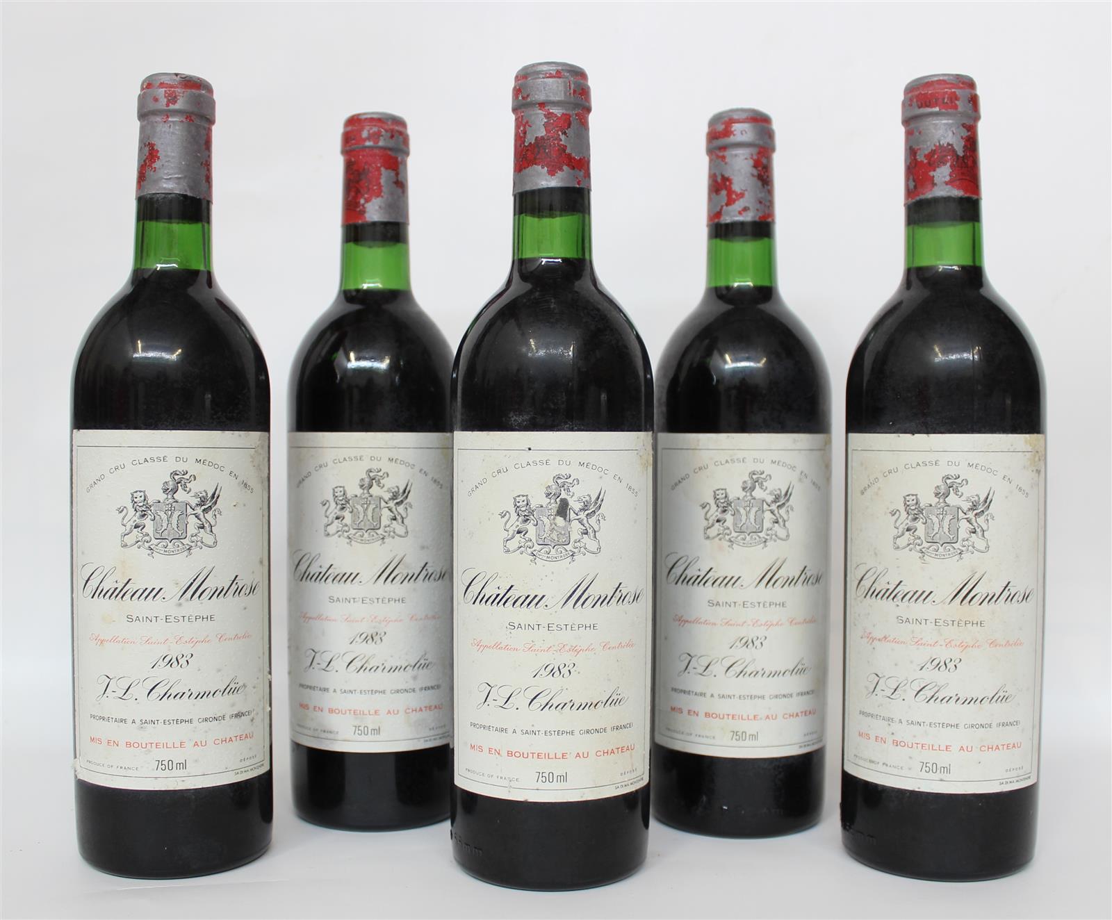 5 Blles CH. MONTROSE St Estèphe GCC 1983 Et. un peu fanées et tachées ( 3 petits accrocs ). N : 3 bas goulot, 2 bas goulot / limite haut épaule