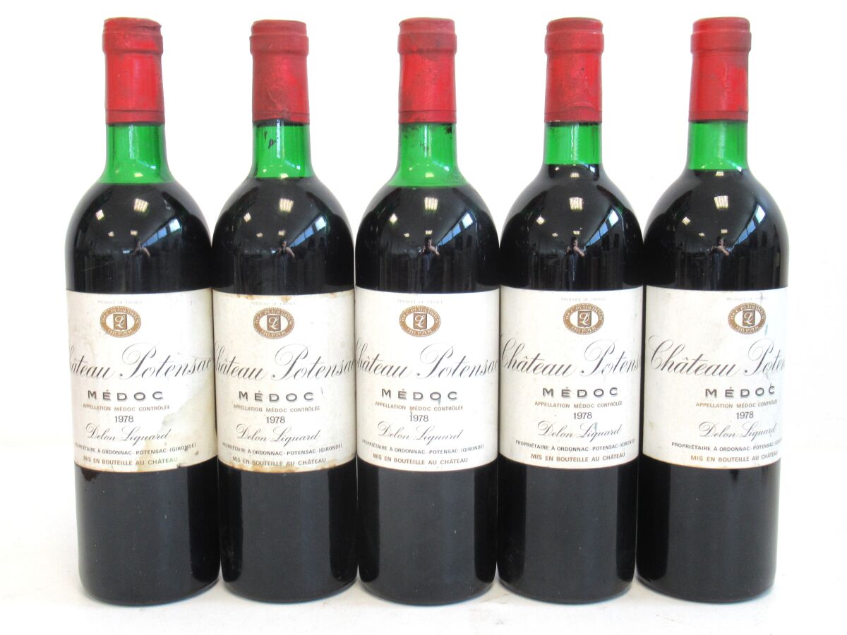 5 Blles CH. POTENSAC Médoc 1978 Et. tachées. N : 1 bas goulot/limite haut épaule, 2 limite haut épaule, 2 haut épaule.