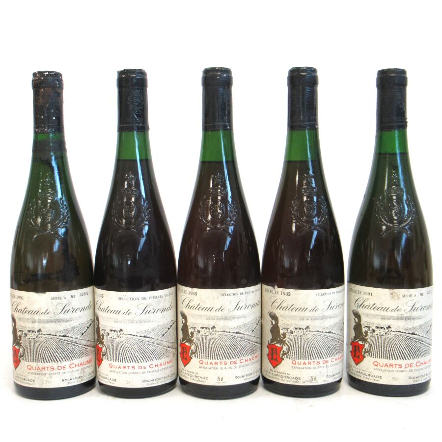 5 Blles QUARTS DE CHAUME Château de Suronde : 2 blles de 1991, 3 blles de 1985. Et. tachées. N : 2 à 3 cm.