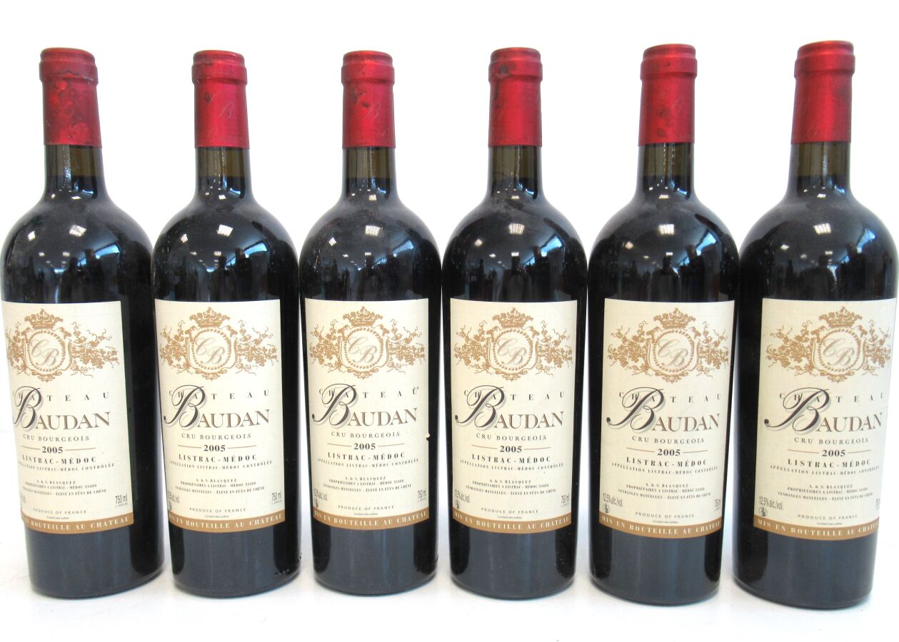 6 Blles CH. BAUDAN Listrac CB 2005 Et. impeccables (1 minuscule accroc). N : mi/bas goulot.