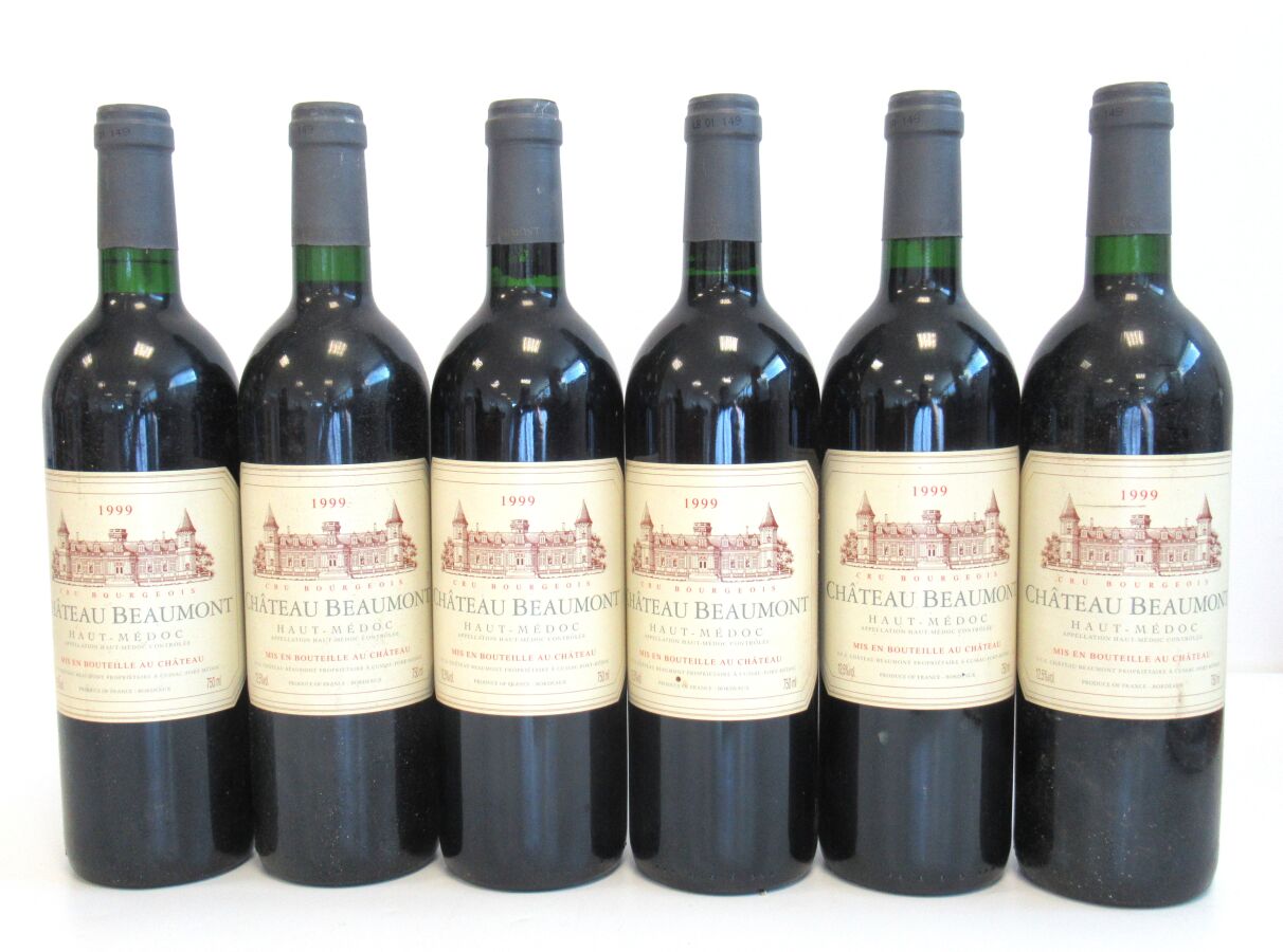 6 Blles CH. BEAUMONT Haut Médoc CB 1999 Et. à peines tachées. N : 4 mi/bas goulot, 2 bas goulot.