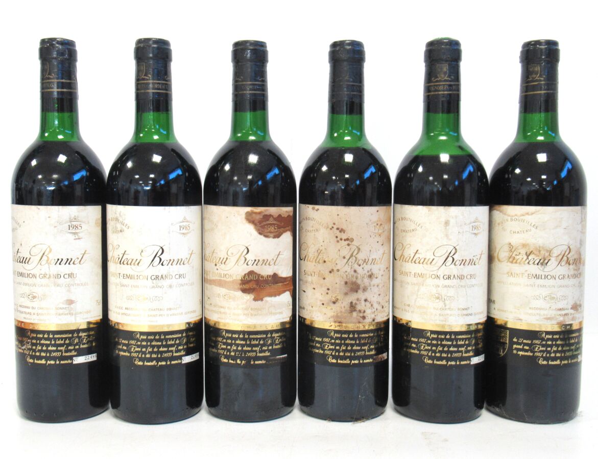 6 Blles CH. BONNET St Emilion GC 1985 Et. plus ou moins tachées. N : 4 limite haut épaule, 1 haut épaule, 1 ht/mi épaule.