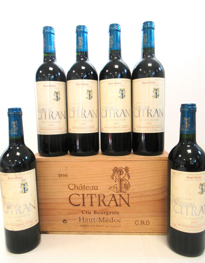 6 Blles CH. CITRAN Haut Médoc CB 1999 Et.: 5 à peine tachées, 1 tachée. N : 5 mi goulot, 1 mi/bas goulot. CBO.