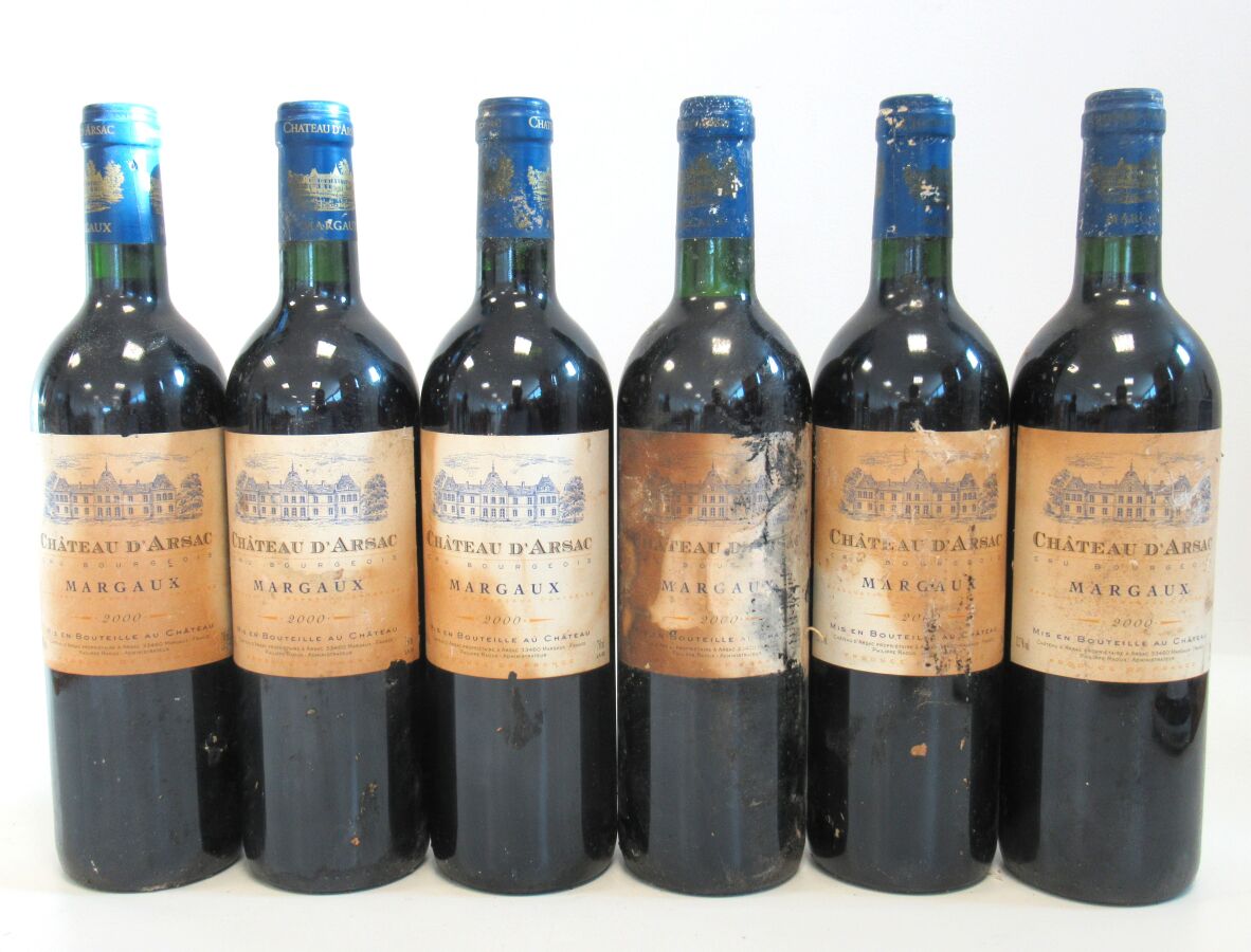 6 Blles CH. D'ARSAC Margaux CB 2000 Et. tachées et usées. N : 1 mi goulot, 4 bas goulot, 1 bas goulot/limite haut épaule.