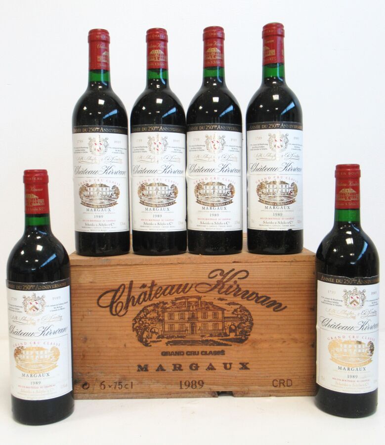 6 Blles CH. KIRWAN Margaux GCC 1989 Et. à peine tachées (quelques petits accrocs). N : mi/bas goulot. CBO.