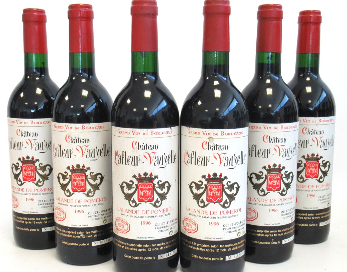 6 Blles CH. LAFLEUR-VAUZELLE Lalande de Pomerol 1996 Et. un peu tachées. N : 2 mi goulot, 4 bas goulot.