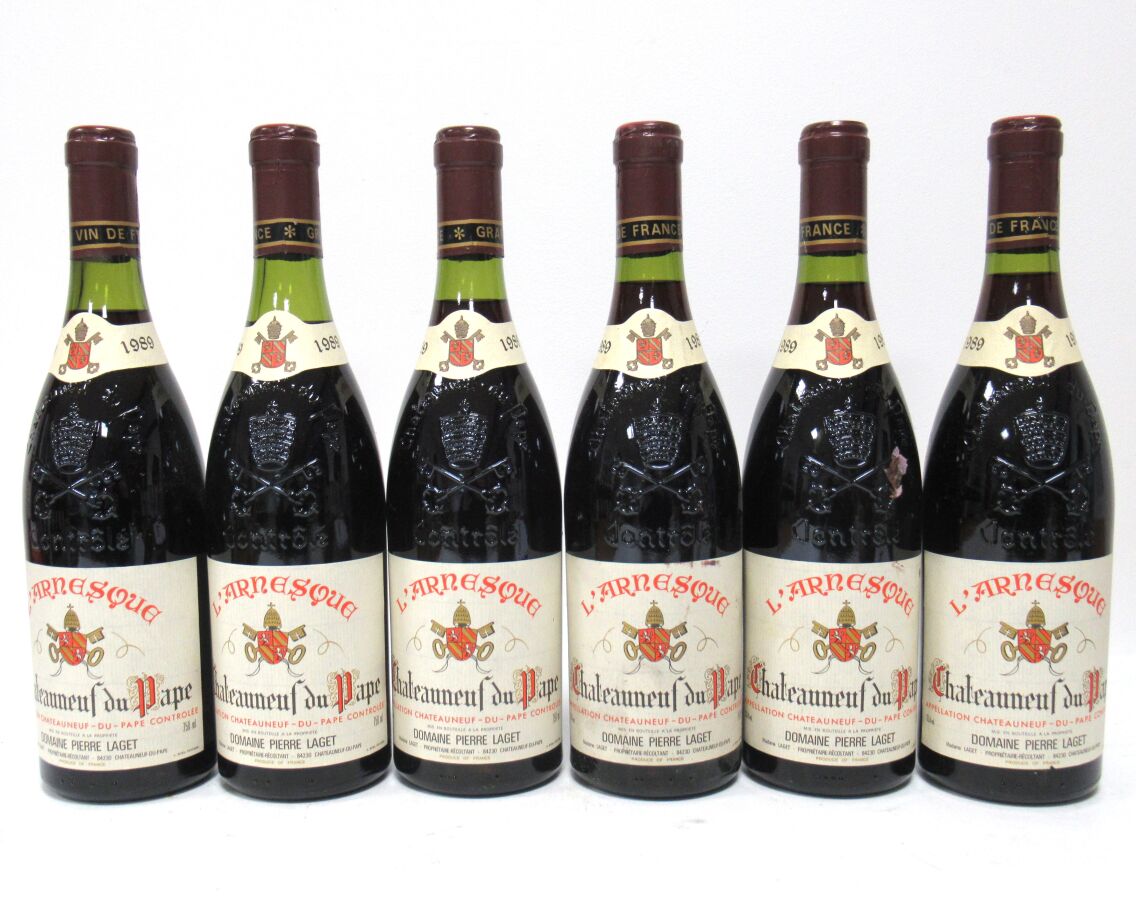 6 Blles CHATEAUNEUF DU PAPE L'Arnesque mise Dom. P. Laget 1989 Et. un peu tachées. N : 1 à 3 cm.
