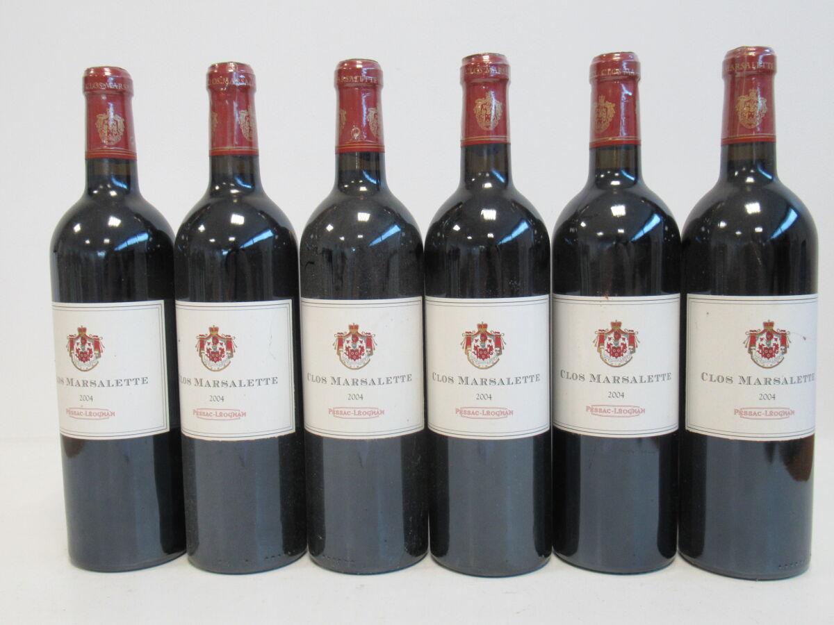 6 Blles CLOS MARSALETTE Pessac Léognan 2004 Et. un peu tachées. N : mi/bas goulot.