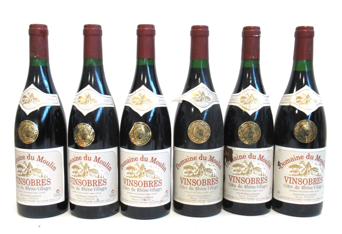6 Blles CÔTES DU RHÔNE VILLAGES rouge Vinsobres Dom. du Moulin : 5 blles de 2002, 1 blle de 2000. Et. un peu tachées. N : 2 cm.