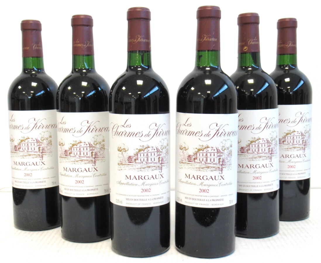 6 Blles LES CHARMES DE KIRWAN Margaux 2002 Et. impeccables. N : bas goulot/ limite haut épaule. CBO.