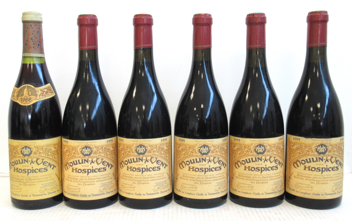 6 Blles MOULIN A VENT des HOSPICES mise Collin-Bourisset 5 blles de 1995, 1 blle de 1988. Et. légèrement tachées. N : 1 à 3 cm.