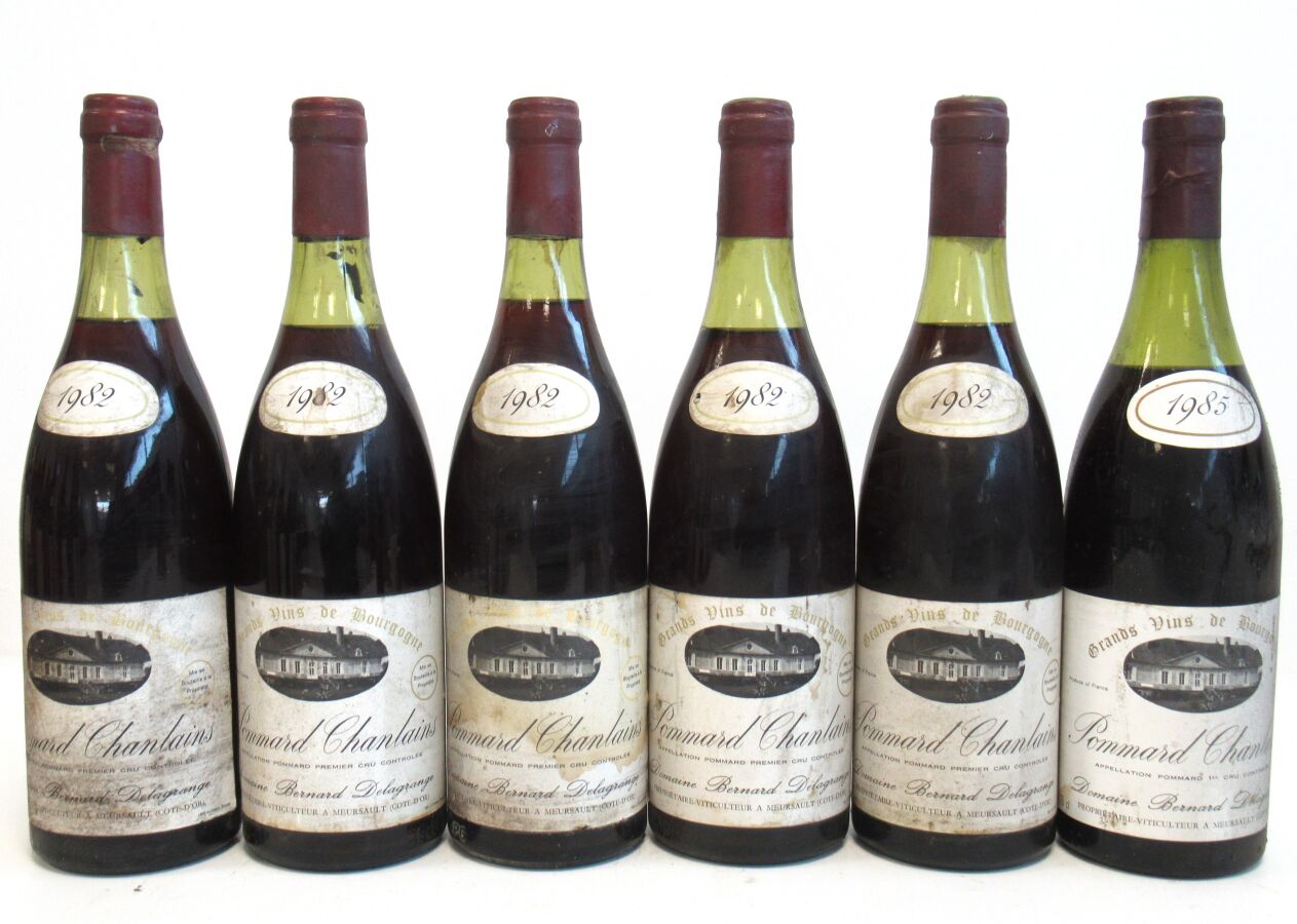6 Blles POMMARD 1er Cru Chanlains mise Dom. Bernard Delagrange Prop. : 1 blle de 1985, 5 blles de 1982. Et. tachées. N : 2,5 à 5 cm.
