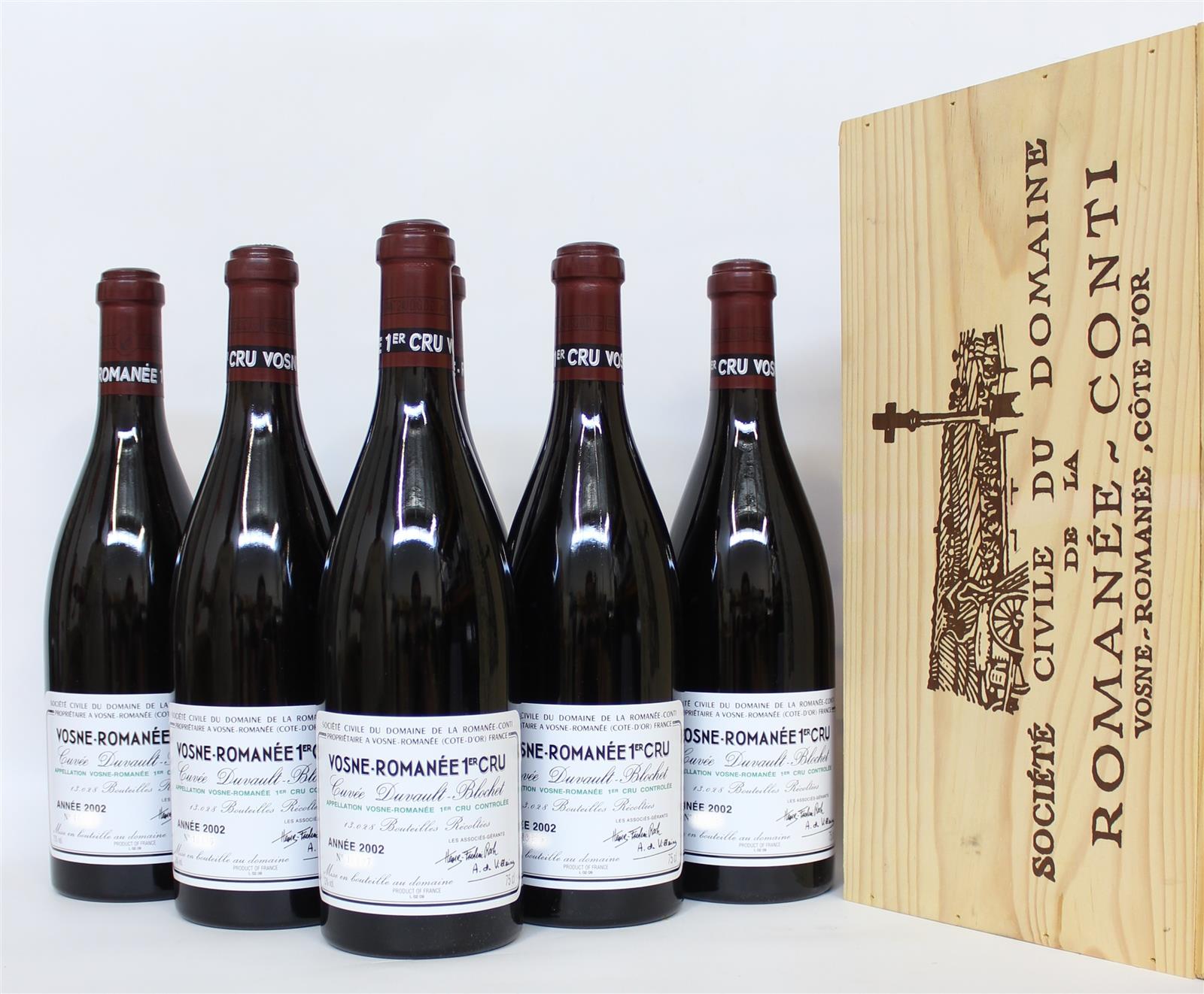 6 Blles VOSNE ROMANÉE 1er Cru mise DRC 2002 Cuvée Duvault-Blochet. Présentation et niveaux impeccables. CBO
