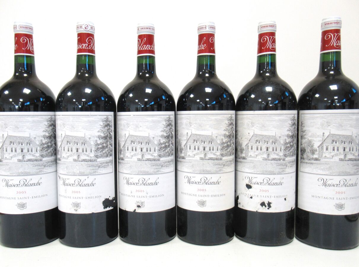 6 Mags CH. MAISON BLANCHE Montagne St Emilion 2005 Et.: 3 impeccables, 3 plus ou moins déchirées, sinon bonnes. N : mi goulot. CBO.