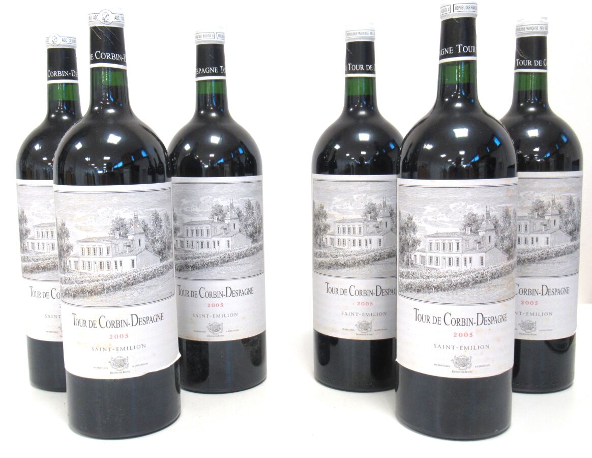 6 Mags CH. TOUR DE CORBIN DESPAGNE St Emilion 2005 Et. légèrement tachées. N : mi goulot. CBO.