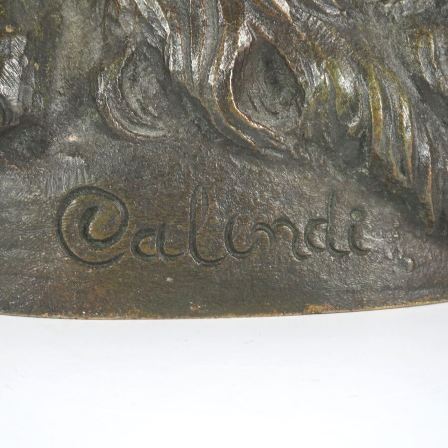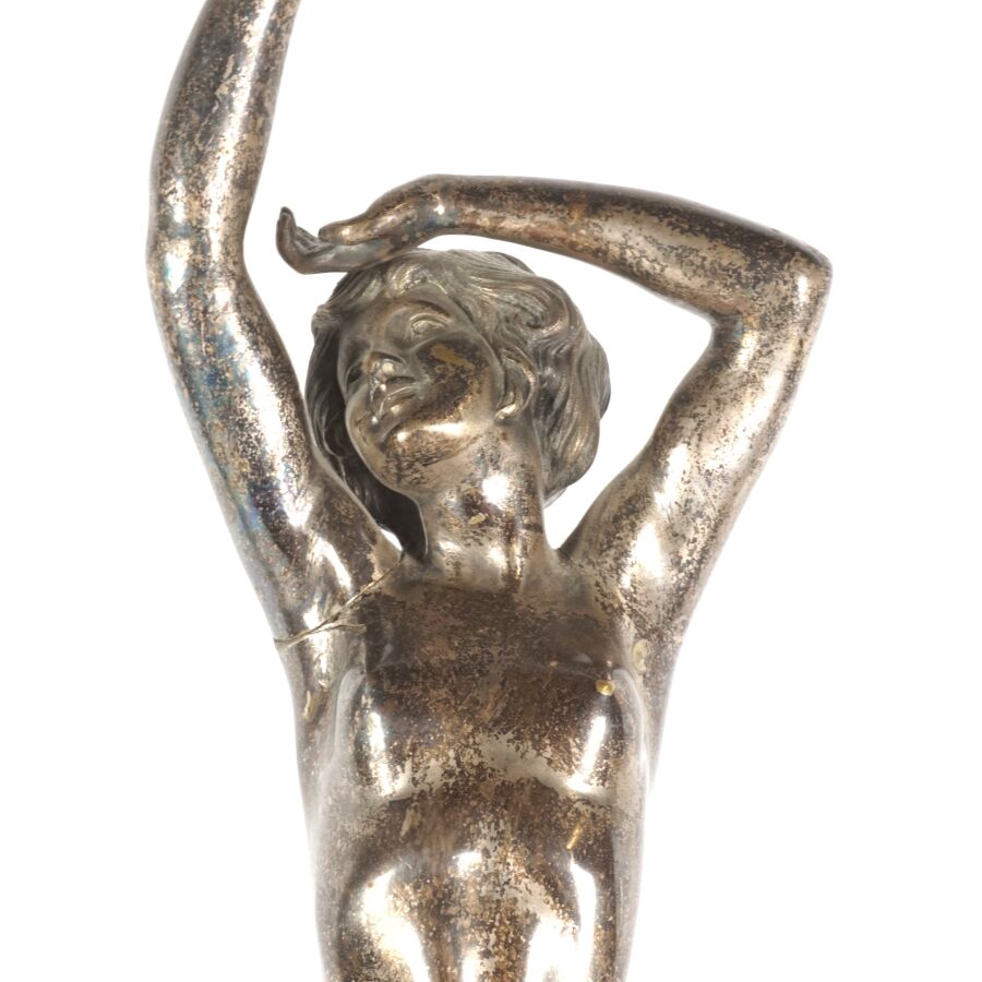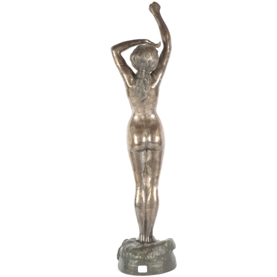 A. CALENDI (XIX-XXe), "Femme nue au poing levé", sujet en bronze à patine argentée, signé sur la terrasse, H. 67.5 cm (restauration à un bras).