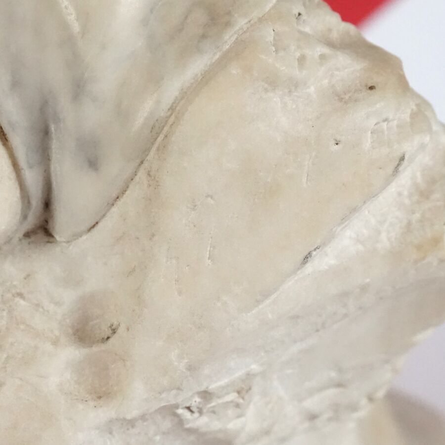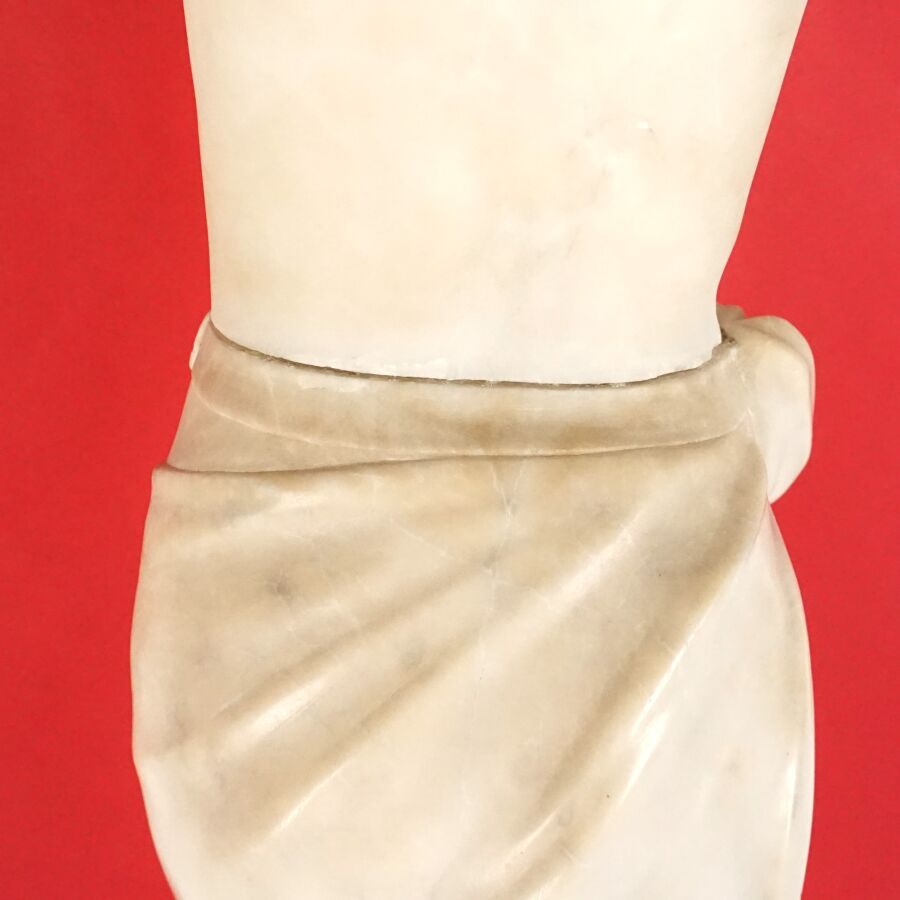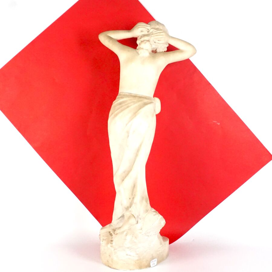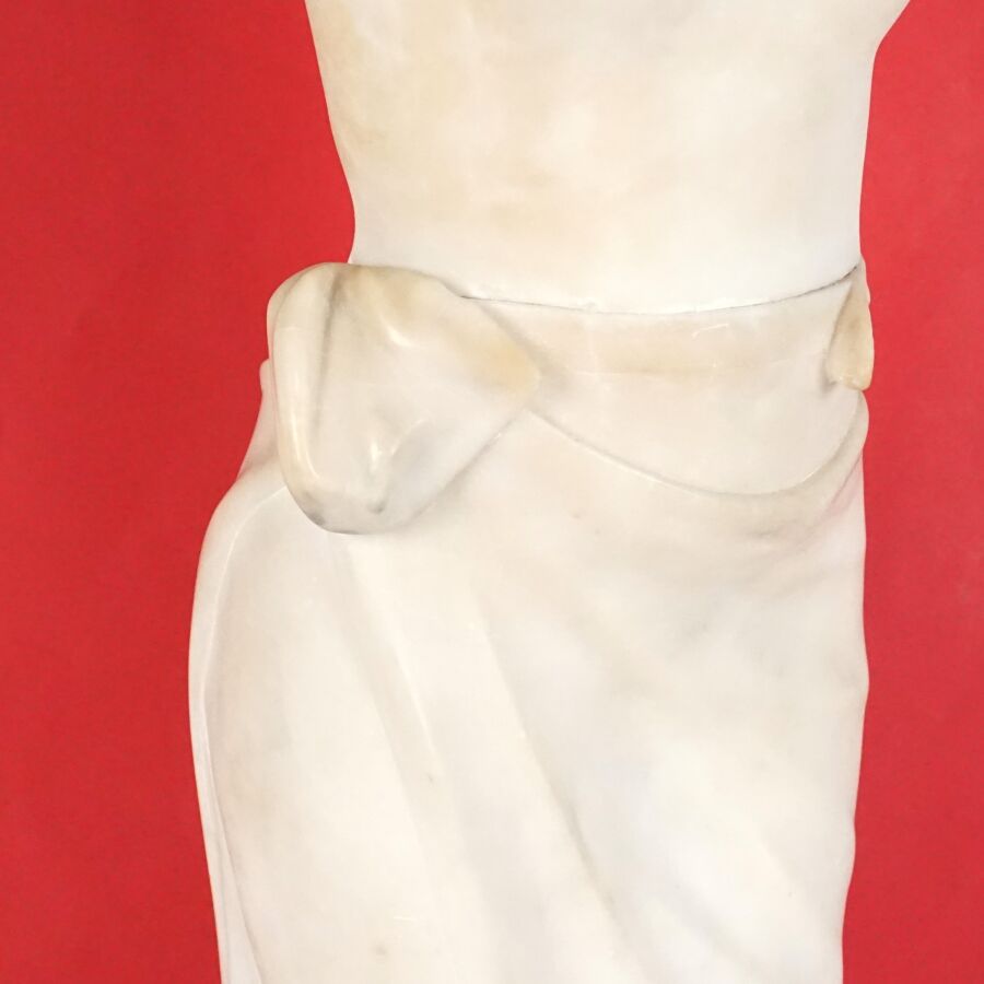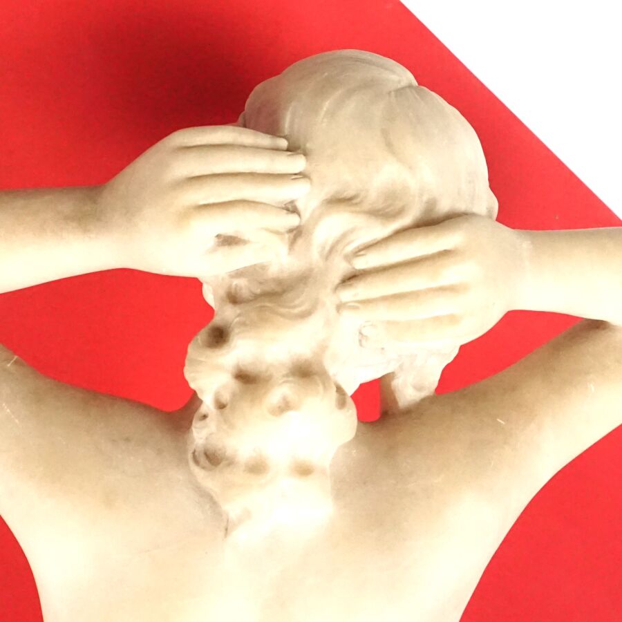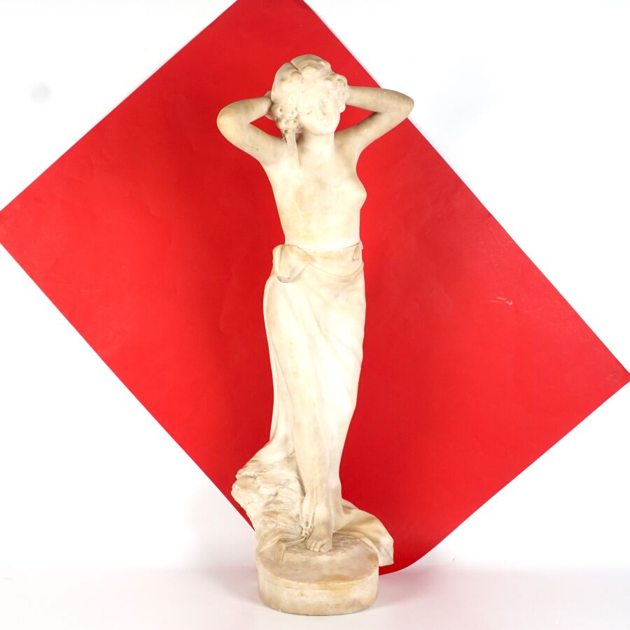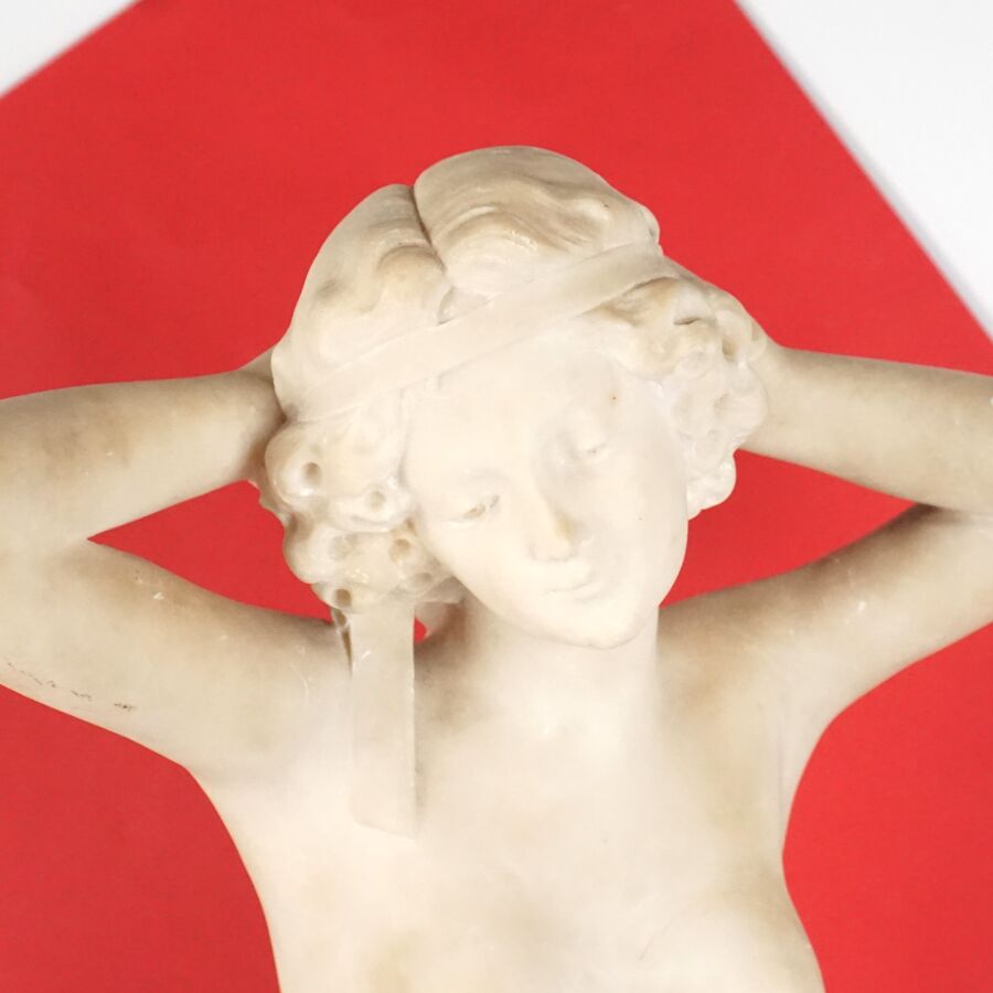 A. GEMAY (XXe), "Femme drapée se coiffant", sculpture en marbre blanc, signée en creux à l'arrière, assemblée en deux éléments au niveau de la taille, H. 61.5 cm (légers éclats).