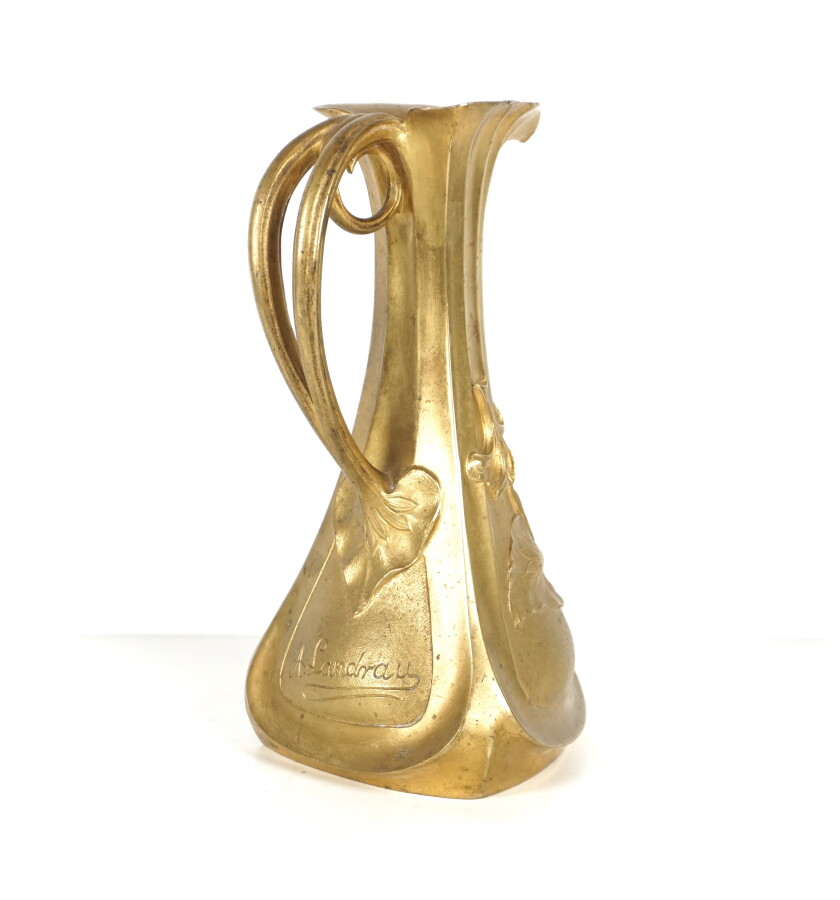 A. LANDRAU (XIXe-XXe), Pichet en bronze doré à corps triangulaire, orné d'une anse florale, le corps à décor d'une tête de femme et de fleurs, signé «A. Landrau» sur l'un des côtés et numéroté dessous BD 564, circa 1900 H. 21 cm.