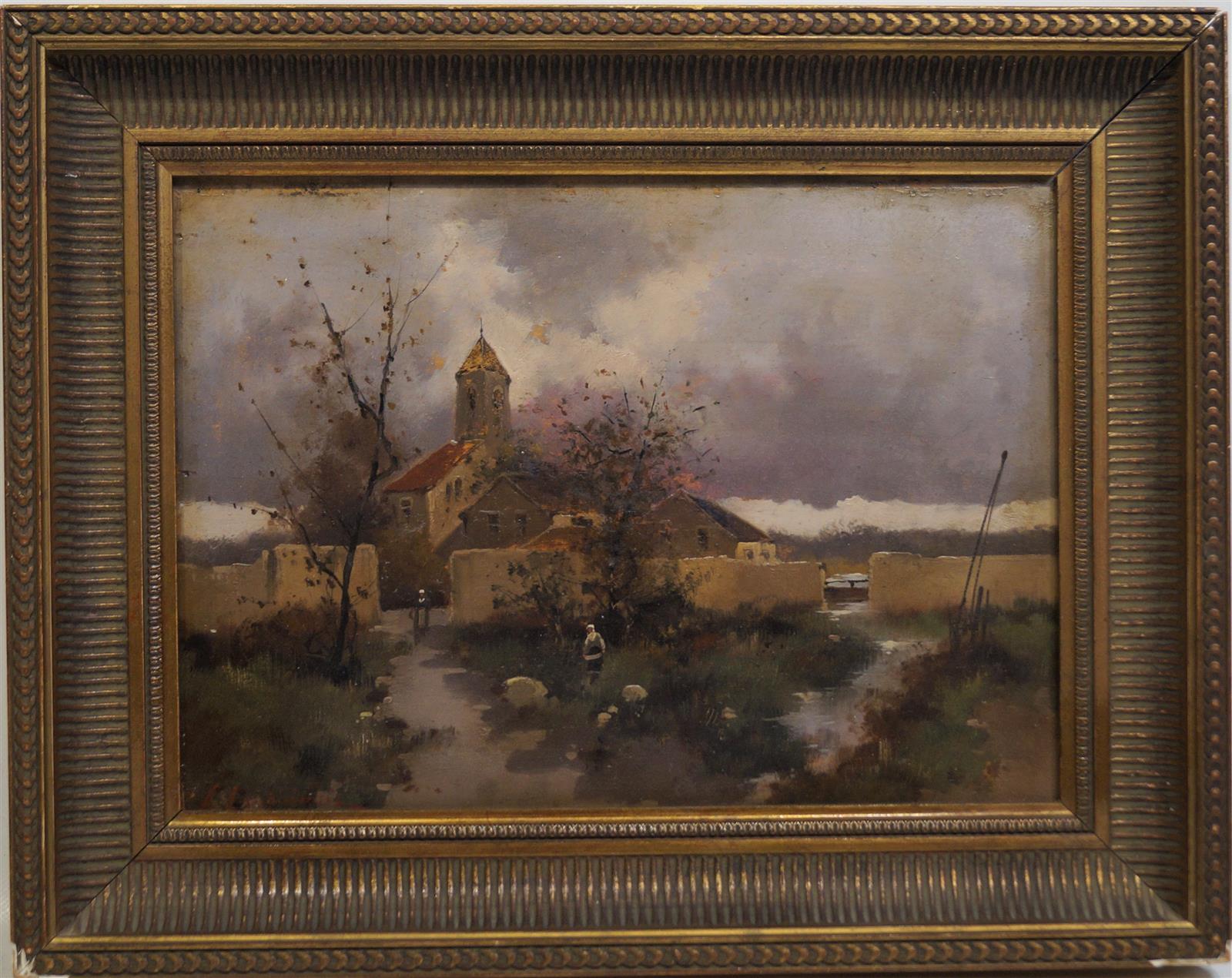 A. LANGUINAIL (?) , "Village animé", huile sur panneau signée en bas à gauche, 24 x 33 cm
