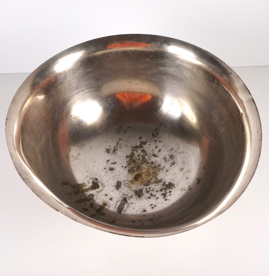 A REPRENDRE CHAMPAGNE MUMM REIMS : Rafraichissoir sur piédouche en métal argenté, inscription gravée sur le piètement, H. 22 cm. Diam : 36.5 cm (chocs, désargentures et traces).
