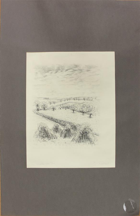 A REPRENDRE Jean FRÉLAUT (1879-1954), "Les meules de foin", gravure à l'eau-forte, titrée en bas à gauche et signée en bas à droite dans la marge, 26.2 x 20.5 cm