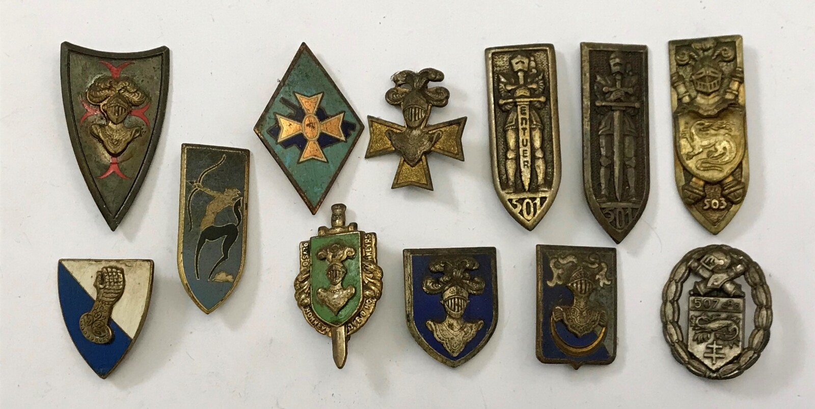 ABC - CHARS COMBAT - Ensemble comprenant 12 INSIGNES : 501 RCC x 2 exemplaires (dont Drago Paris Béranger, épingle ressoudée), 503ème RCC (Sans), 507ème CRC (G2924 - Fraisse Paris), CENTRE DE TIR ENGINS BLINDES (G1133 - Drago Paris), ECOLE D'APPLICATION ABC (H603 - Drago Paris), ECOLE ABC HUSSEIN - DEY (H504 - Drago Paris), CENTRE INSTRUCTION ARME BLINDEE et TRAIN (G1919 - Drago Paris), CENTRE D'INSTRUCTION DES DIVISIONS BLINDEES (G1262 - Drago Paris), 3ème DIVISION BLINDEE (Drago Paris Nice Olivier Métra, épingle ressoudée), 5ème DIVISION BLINDEE (OFSI Paris) et 1ère DIVISION BLINDEE (Sans), la plupart de ces insignes ont été vernis et un nettoyage à l'acétone leur redonnera leur aspect d'origine, BE.
