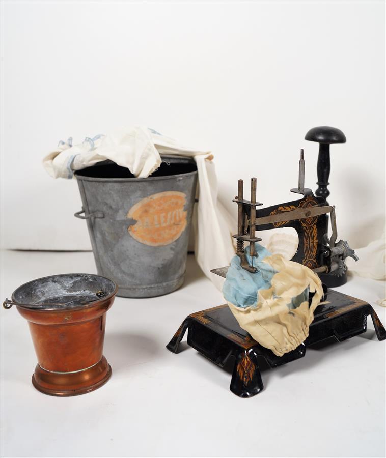 Accessoires de blanchisserie : Fourneau, nombreux petits fers à repasser, porte-fers, machine à coudre et divers. H Fourneau. 36.5 cm (petits manques).