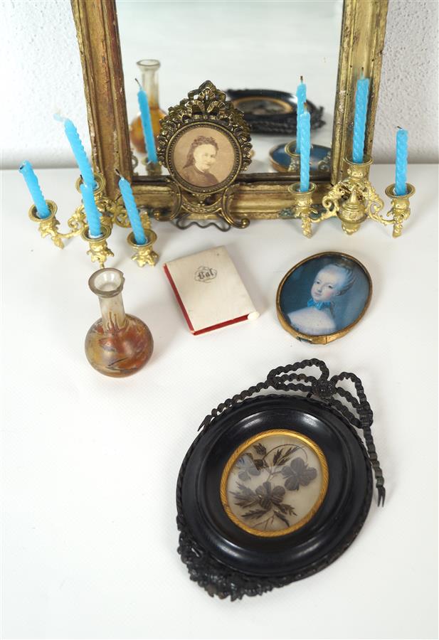 Accessoires miniatures : Vase en verre irisé, paire d'appliques en métal doré, carnet de bal, miroir et divers.
